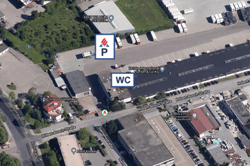 Die Toiletten und Duschen befinden sich im Erdgeschoss des Gebäudes der Spedition. Bitte folgen Sie der KRAVAG Truck Parking Beschilderung und die Luftbildaufnahme beachten.